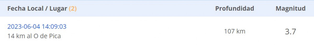 El último temblor registrado en Chile sucedió HOY, 4 de junio, a las 17.46 horas al sureste de PICA. El movimiento sísmico tuvo una magnitud de 3.7 y fue a una profundidad de 49 km.