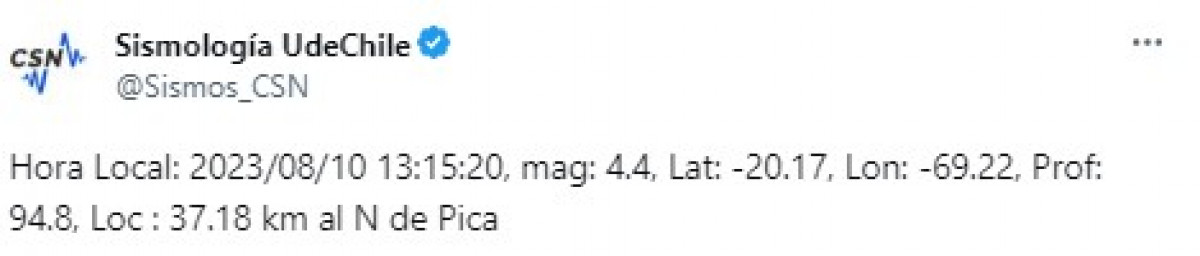 El último temblor registrado en Chile este 10 de agosto, fue a las 13:15 horas al norte de Pica. El movimiento sísmico tuvo una magnitud de 4.4 y fue de una profundidad de 94 km.