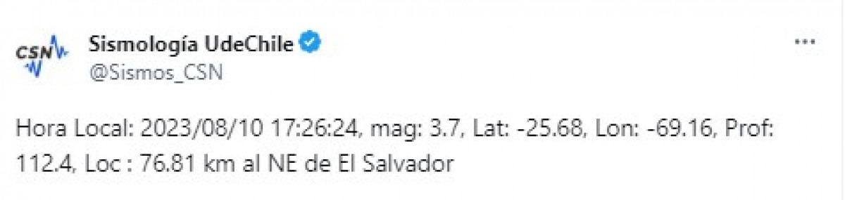 El último temblor registrado en Chile este 10 de agosto, fue a las 17.26 horas al noreste de El Salvador. El movimiento sísmico tuvo una magnitud de 3.7 y fue de una profundidad de 112.4 km.