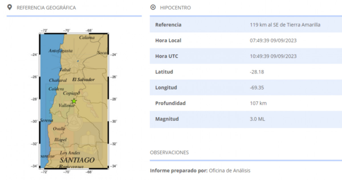 El último temblor registrado en Chile este 9 de septiembre, fue a las 07.49 horas al sureste de Tierra Amarilla. El movimiento sísmico tuvo una magnitud de 3.0 y tuvo una profundidad de 107 km.