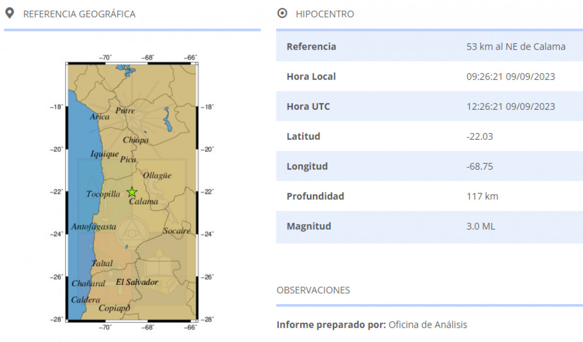 El último temblor registrado en Chile este 9 de septiembre, fue a las 09.26 horas al noroeste de Calama. El movimiento sísmico tuvo una magnitud de 3.0 y tuvo una profundidad de 117 km.
