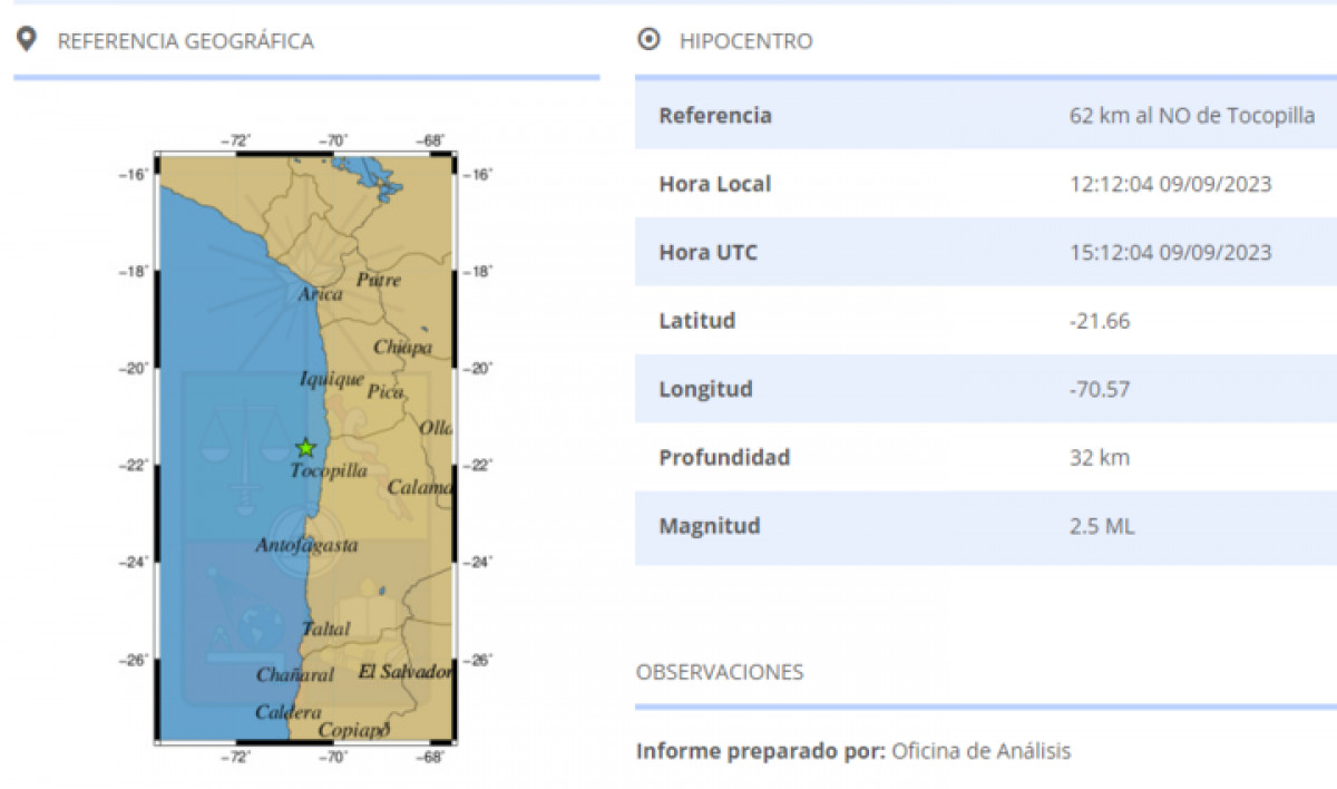 El último temblor registrado en Chile este 9 de septiembre, fue a las 12.12 horas al noroeste de Tocopilla. El movimiento sísmico tuvo una magnitud de 2.5 y tuvo una profundidad de 32 km.