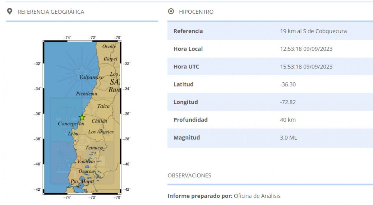 El último temblor registrado en Chile este 9 de septiembre, fue a las 12.53 horas al sur de Cobquecura. El movimiento sísmico tuvo una magnitud de 3.0 y tuvo una profundidad de 40 km.