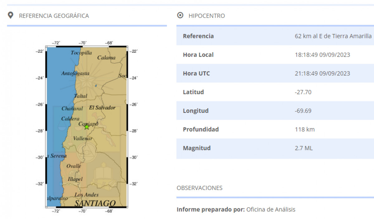 El último temblor registrado en Chile este 9 de septiembre, fue a las 18.18 horas al este de Tierra Amarilla. El movimiento sísmico tuvo una magnitud de 2.7 y tuvo una profundidad de 118 km.
