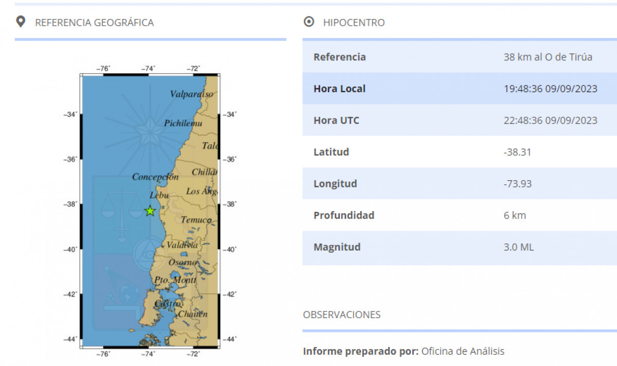 El último temblor registrado en Chile este 9 de septiembre, fue a las 19.48 horas al oeste de Tiruja. El movimiento sísmico tuvo una magnitud de 3.0 y tuvo una profundidad de 6 km.