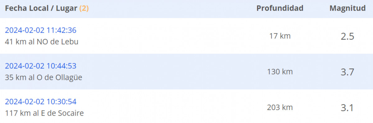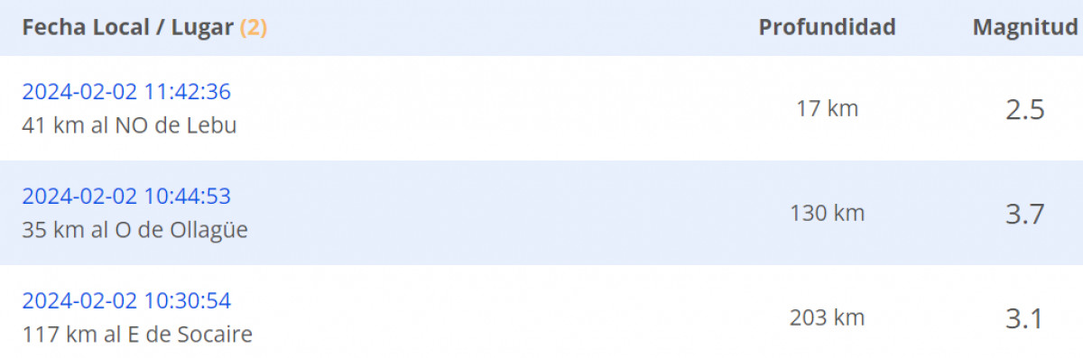 Estos son los últimos 3 temblores reportados en Chile, dentro de los que el más reciente fue en Lebu, a las 11:42 horas. Tuvo una magnitud de 2,5 y una profundidad de 17 km.