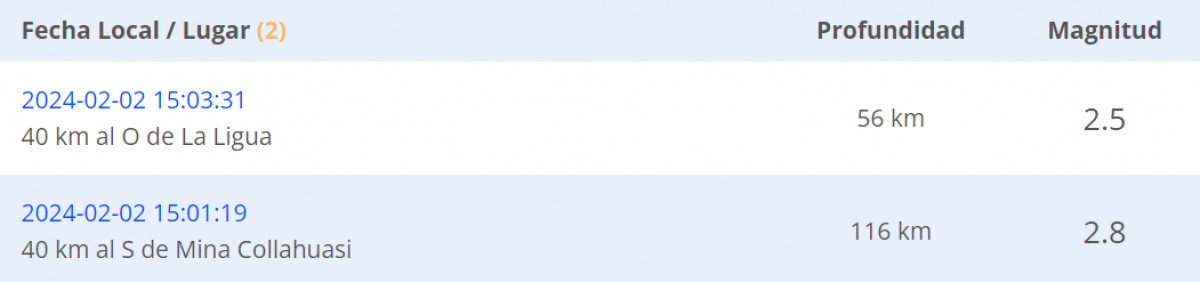 Estos son los últimos 2 temblores reportados en Ligua, dentro de los que el más reciente fue en Lebu, a las 15:03 horas. Tuvo una magnitud de 2,5 y una profundidad de 56 km.