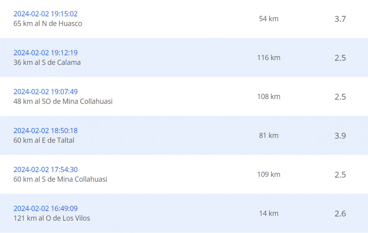 El más reciente sismo reportado por el SSN fue a las 19:15 horas en Huasco. Tuvo una magnitud de 3.7 y una profundidad de 54 km.