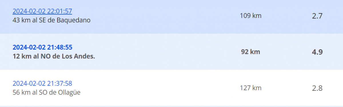 El más reciente sismo fue reportado en Baquedano a las 22:01 horas. Tuvo una magnitud de 2.7 y una profundidad de 109 km.