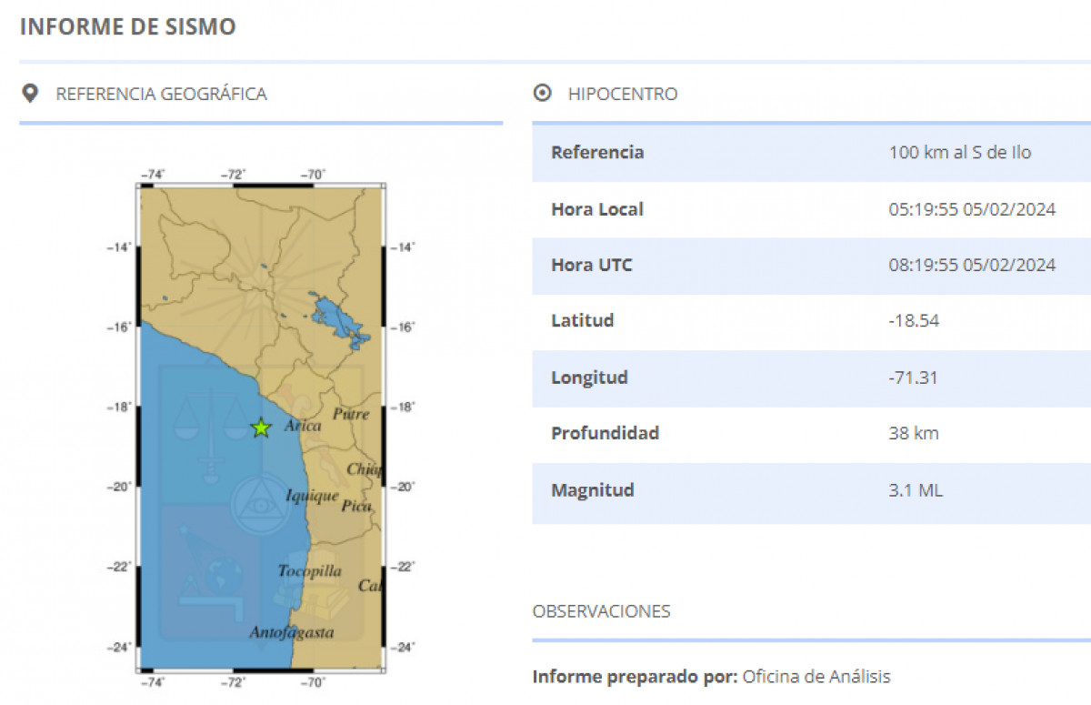 Un fuerte sismo fue reportado HOY, al sur de Ilo, Perú, a las 5.19 horas. Tuvo una magnitud de 3.1 y una profundidad de 38 km.