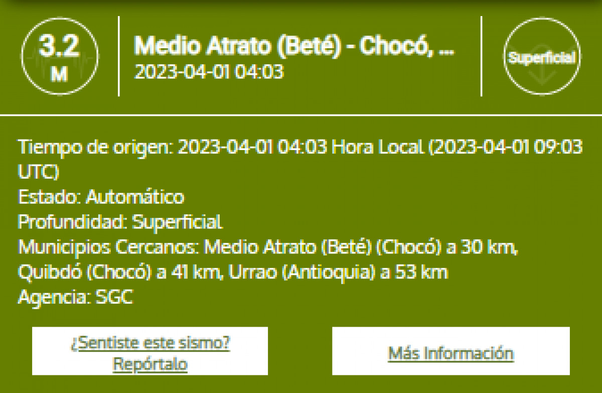 El último temblor registrado en Colombia sucedió hoy, sábado 1 de abril, a las 04:03 horas en Medio Atrato. El movimiento sísmico tuvo una magnitud de 3.2 y fue a una profundidad superficial.