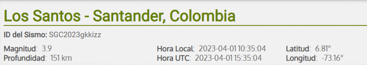 ¡Atención! El SGC reportó un temblor de 3.9 grados de magnitud en Colombia. Según la entidad, el epicentro del sismo localizó en la localidad de Los Santos, Santander.