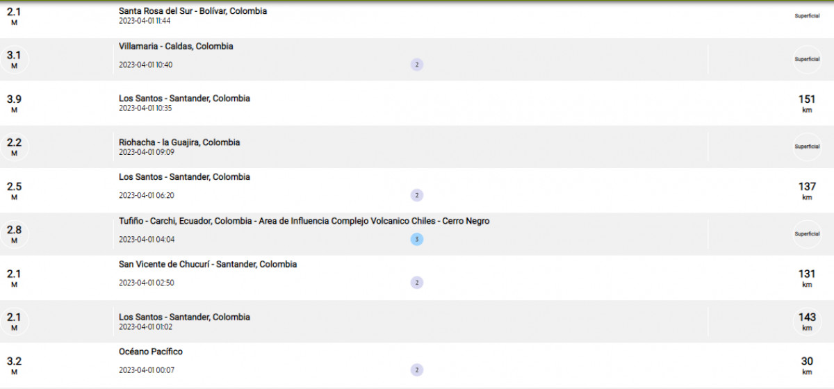 El último temblor registrado en Colombia sucedió el 1 de abril a las 11.44 horas en Santa Rosa del Sur, Bolívar. El movimiento sísmico tuvo una magnitud de 2.1 y fue a una profundidad menor a 70 km.
