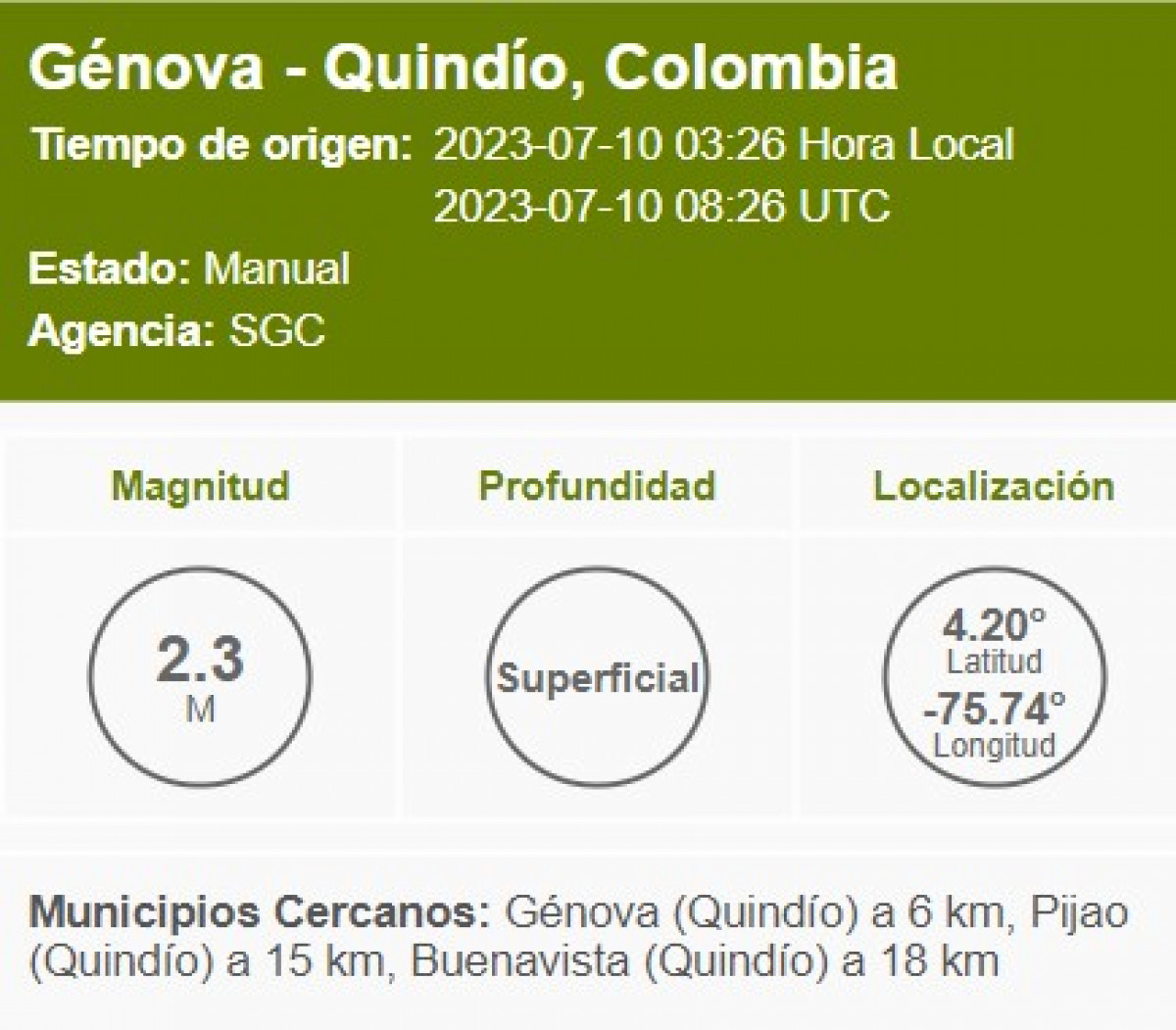 El último temblor registrado en Colombia sucedió este 10 de julio a las 03.26 horas en Génova, Quindío. El movimiento sísmico tuvo una magnitud de 2.3 y fue a una profundidad superficial.
