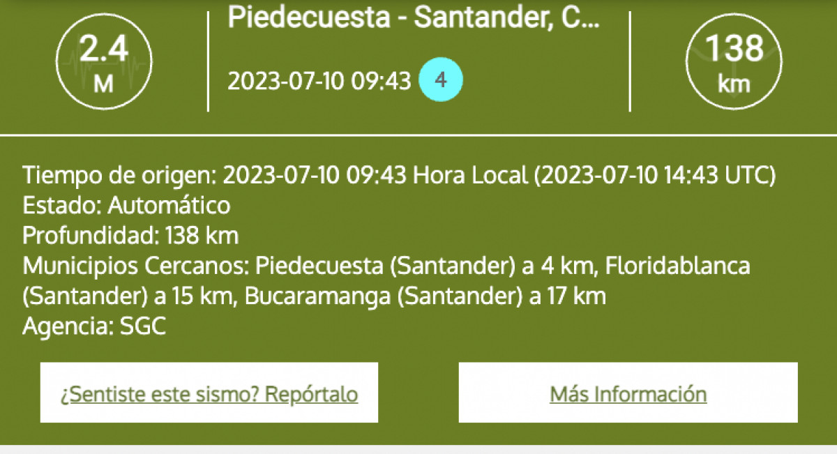 El último temblor registrado en Colombia sucedió este 10 de julio a las 09:43 horas en Piedecuesta, Santander. El movimiento sísmico tuvo una magnitud de 2.4 y fue a una profundidad de 138 km.