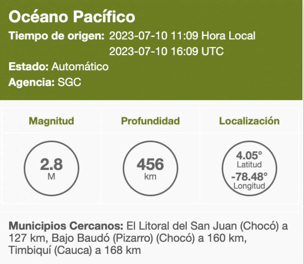 El último temblor registrado en Colombia sucedió este 10 de julio a las 11:09 horas en el Océano Pacífico. El movimiento sísmico tuvo una magnitud de 2.8 y fue a una profundidad de 456 km.