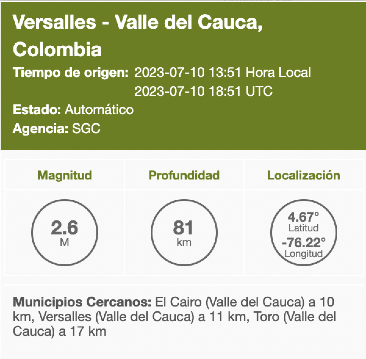 El último temblor registrado en Colombia sucedió este 10 de julio a las 13:51 horas en Versalles, Valle del Cauca. El movimiento sísmico tuvo una magnitud de 2.6 y fue a una profundidad de 81 km.