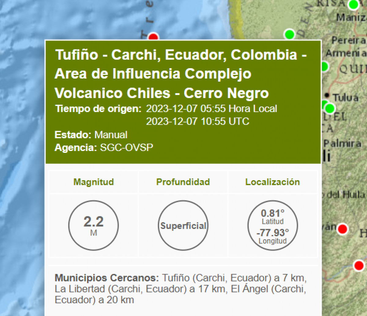 Un sismo fue reportado en Colombia, en Tufiño, Carchi, a las 05:55 horas. Tuvo una magnitud de 2.2 y una profundidad de manera superficial.
