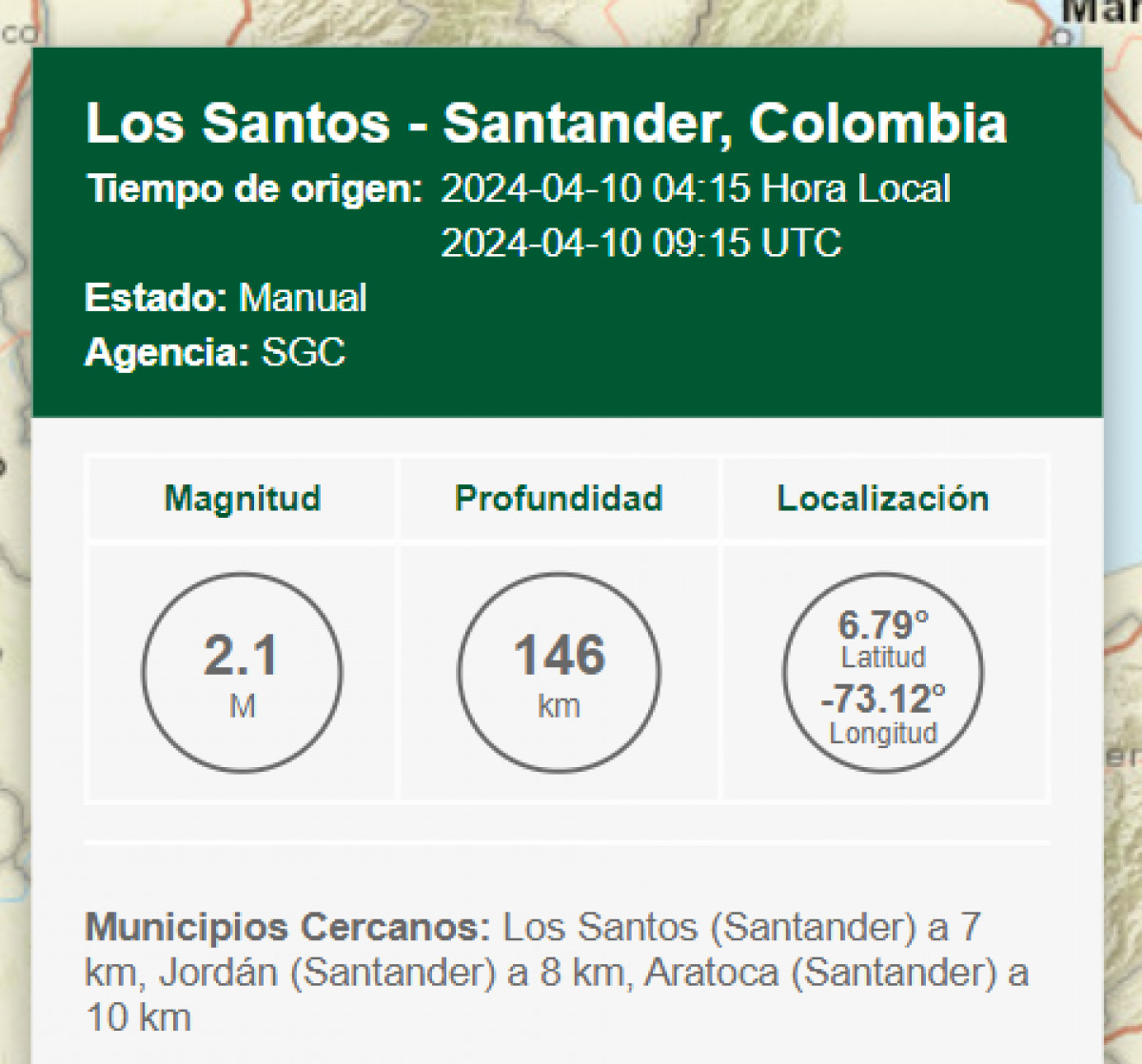 El SGC registró un sismo de magnitud 2.1, con una profundidad de 146 km, en Los Santos, Santander, a las 04.15 horas.