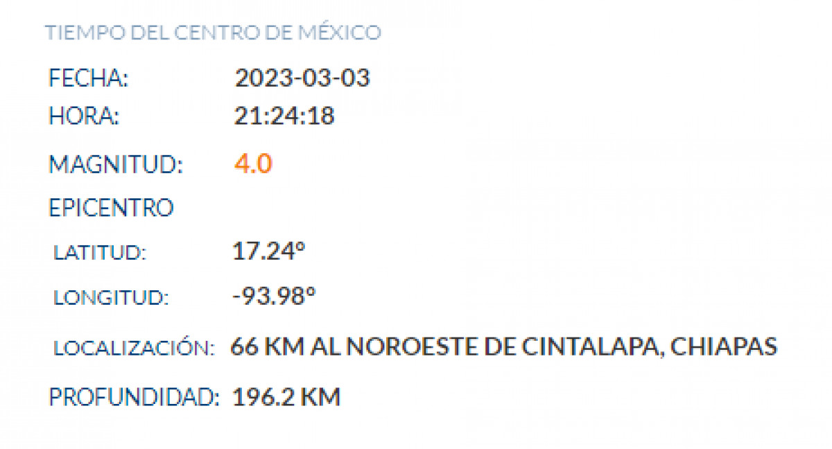 El último temblor en México ocurrió ayer, viernes 3 de marzo, al noroeste de Cintalapa, Chiapas, a las 21.24 p. m., con una magnitud de 4.0.