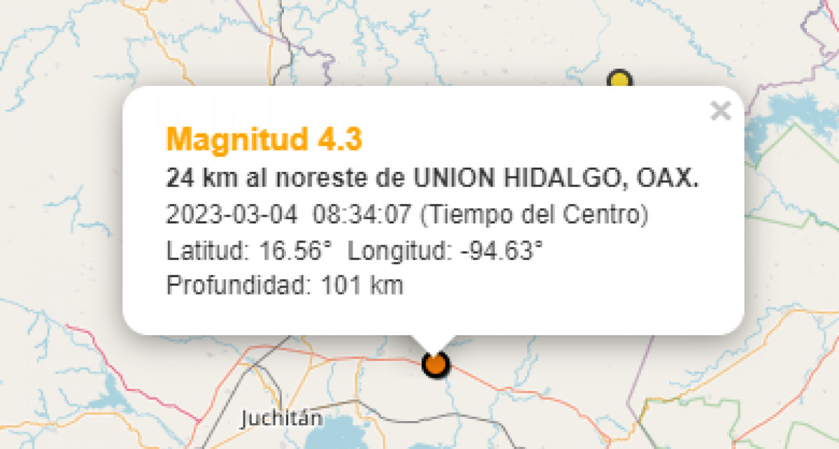 El último temblor en México ocurrió este sábado 4 de marzo a las 08.34 horas en el noreste de Unión Hidalgo, Oaxaca. con una magnitud de 4.3 y una profundidad de 101 km.