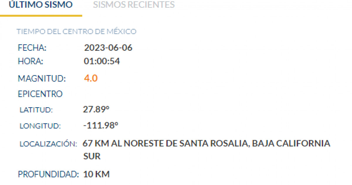 El último temblor en México ocurrió hoy, 6 de junio, al noreste de Santa Rosalía, Baja California, a la 01.00a. m., con una magnitud de 4.0.
