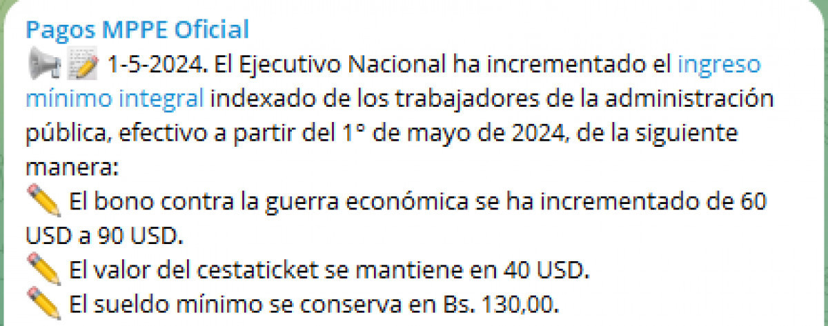 Pagos anunciados por cuenta de MPPEEn la cuenta de Telegram del MPPE se anunciaron los nuevos montos del Bono de Guerra que se darán luego del comunicado en vivo que brindó el presidente Nicolás Maduro.