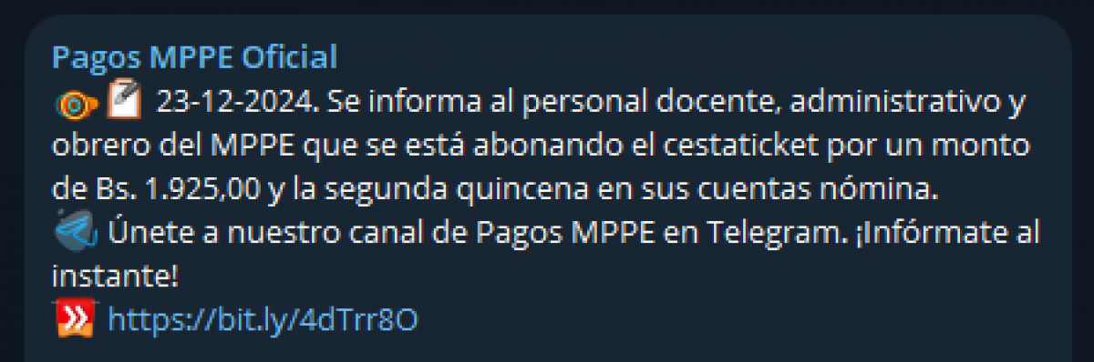 El 23 de diciembre de 2024, el Ministerio de Educación de Venezuela anunció el pago de la segunda quincena y el Cestaticket de este mes. Estos depósitos llegaron vía nómina al personal docente, administrativo y obrero del MPPE.