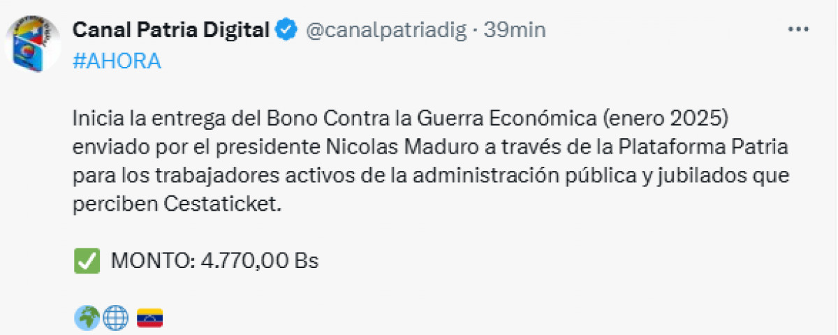 El Bono de Guerra entregó el pago a través del Sistema Patria para trabajadores activos de la administración pública y jubilados que perciben en Cestaticket.