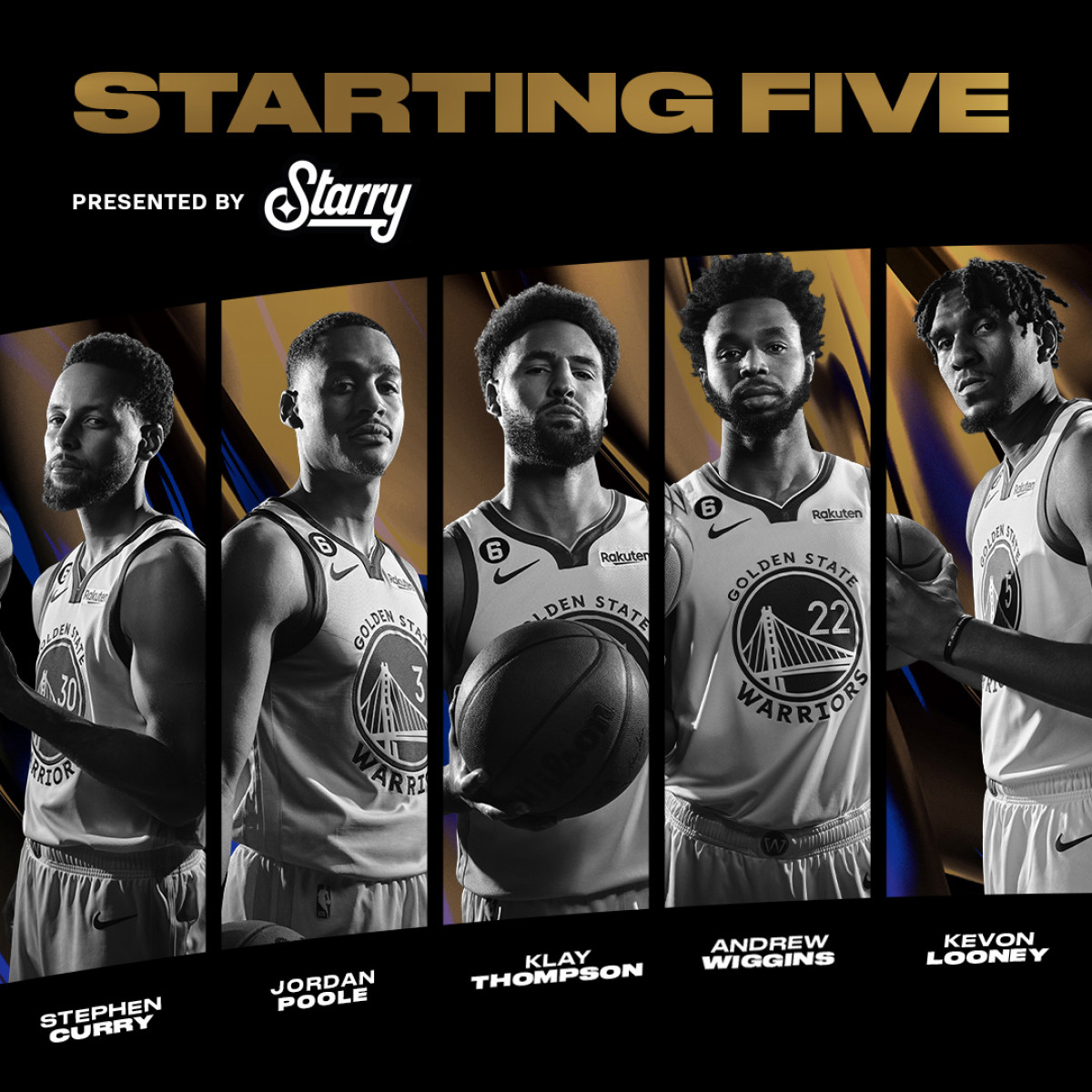 Quinteto inicial de los Warrriors: Stephen Curry, Jordan Poole, Klay Thompson, Andrew Wiggins, Kevon Looney. Foto: Golden State Warriors