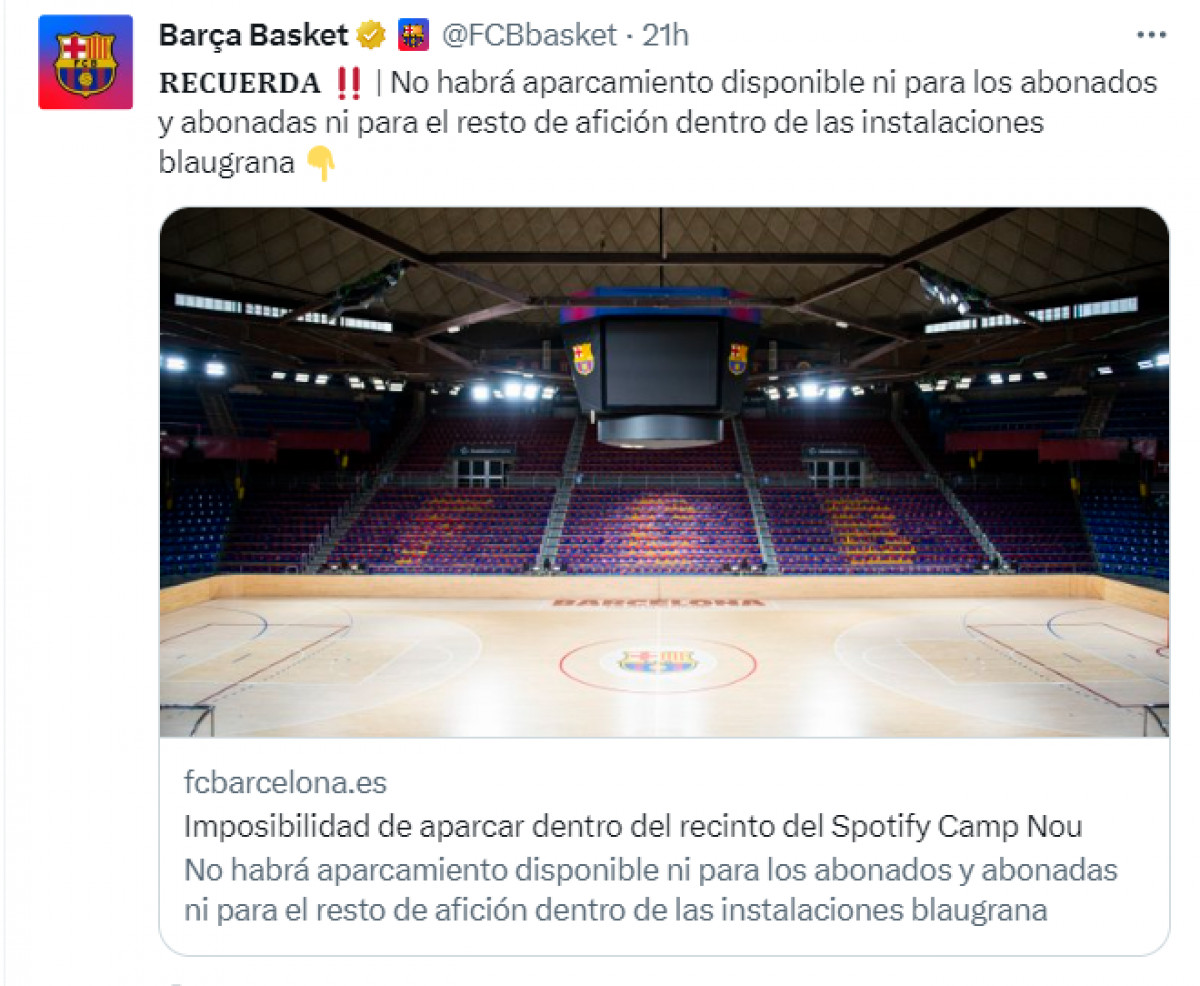 A través de un comunicado, Barcelona anunció que no habrá aparcamiento disponible ni para los abonados ni el resto de aficionados que acudan al Palau Blaugrana.