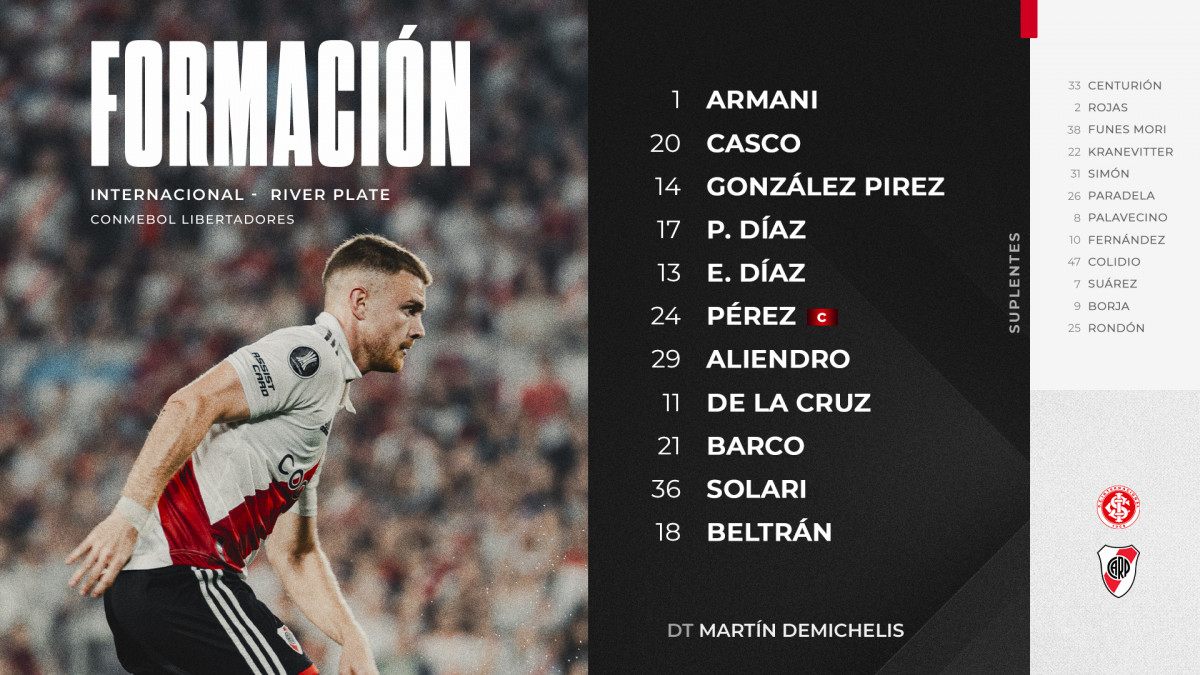 Esta es la posible oncena titular del equipo argentino: Franco Armani; Milton Casco, Leandro González Pirez, Paulo Díaz, Enzo Díaz; Enzo Pérez, Rodrigo Aliendro; Nicolás de la Cruz, Nacho Fernández, Esequiel Barco; y Lucas Beltrán.