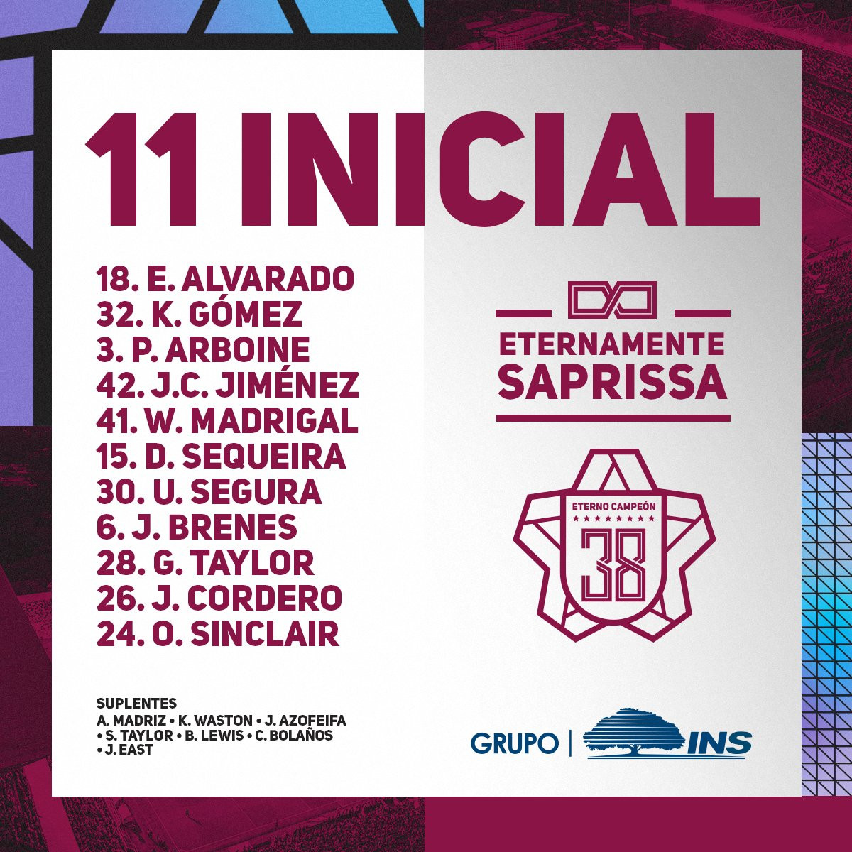 Equipo titular de los morados: Alvarado, Gómez, Arboine, Jiménez, Madrigal, Sequeira, Segura, Brenes, Taylor, Cordero, Sinclair. Foto: Deportivo Saprissa
