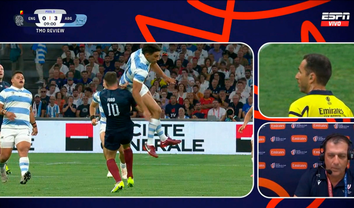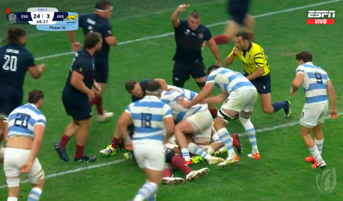 Minuto 4. Un tackle alto de Tom Curry contra Mallía implica una tarjeta amarilla para el inglés luego de una revisión. Argentina pedirá palos.