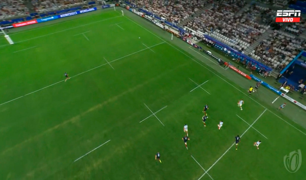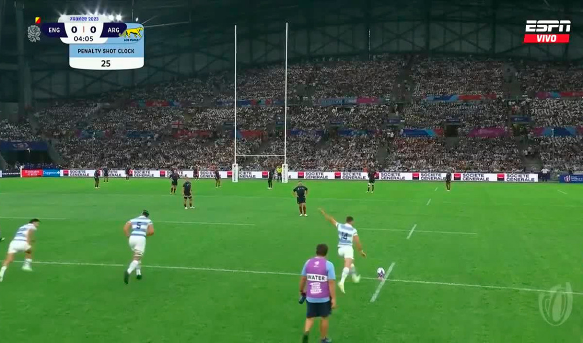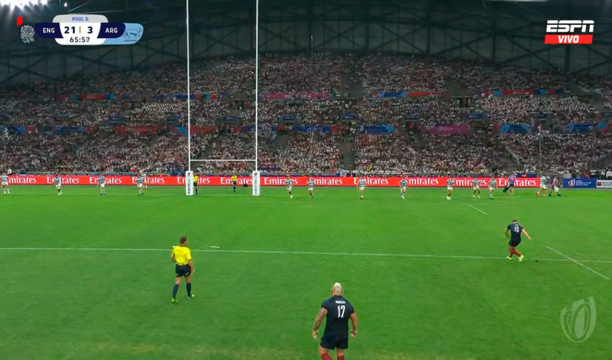 Minuto 21. Los Pumas tienen su primer gran acercamiento al in-goal inglés gracias a una patada de Santiago Carreras. Foto: ESPN
