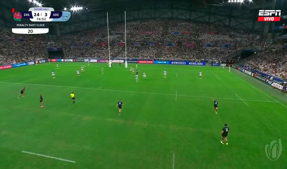 Minuto 24. Un gran acercamiento de los Pumas se acaba por sacar los pies del ruck. Inglaterra patea para retomar el control.