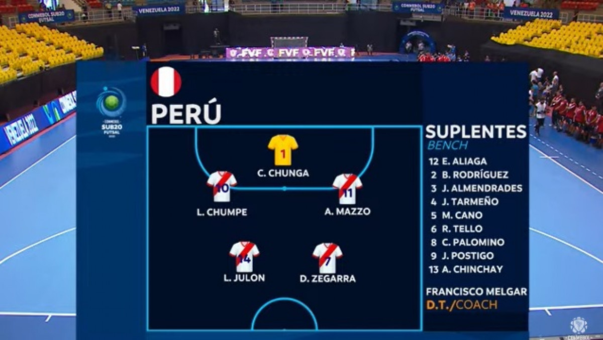 Equipo titular de la selección peruana: Chunga, Chumpe, Mazzo, Julon, Zegarra. Foto: captura de Conmebol