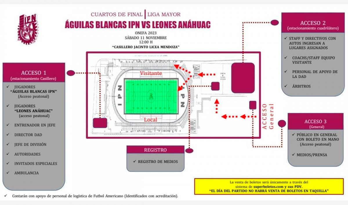 El Instituto Politécnico Nacional compartió un mapa con los accesos que tendrán los asistentes al Casco de Santo Tomás para el juego de Águilas Blancas vs. Leones. Está prohibido el ingreso de mascotas, botellas de vidrio, cilindros para agua, tambores y drones. Foto: IPN