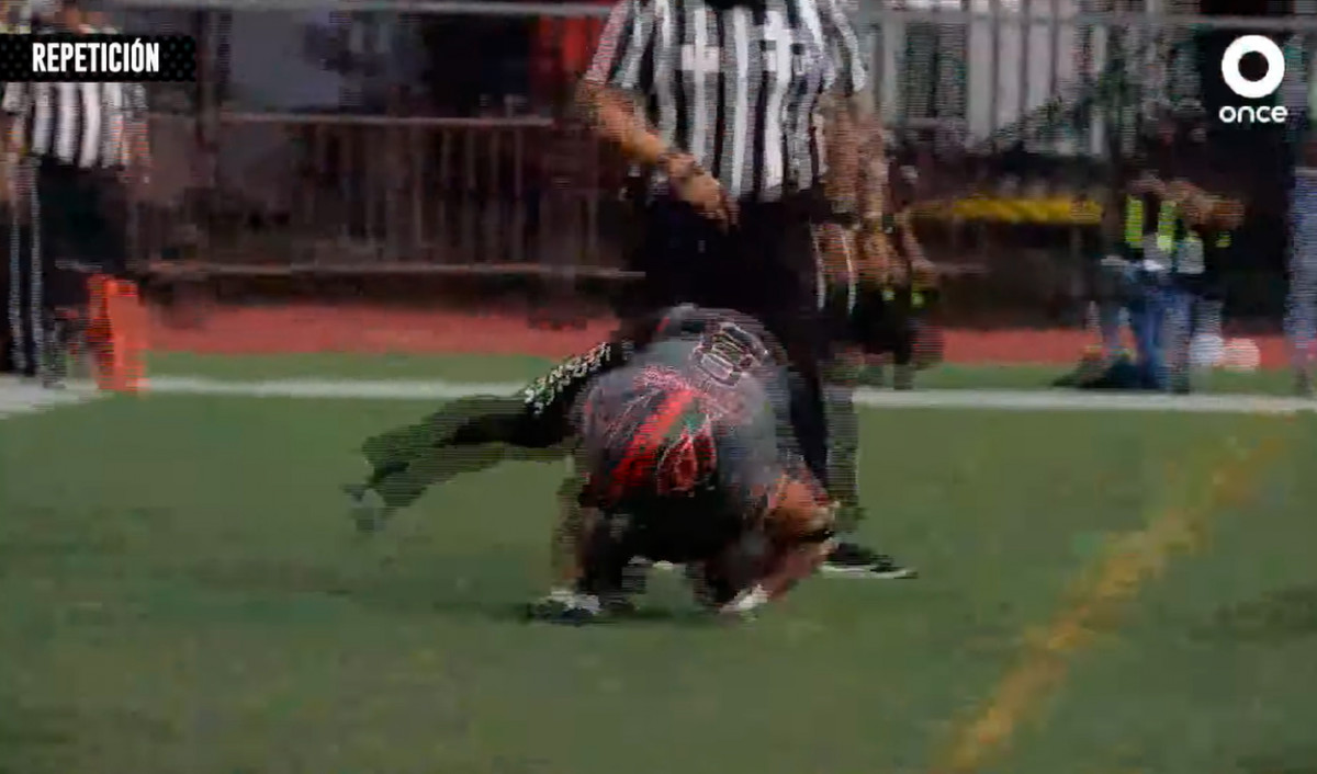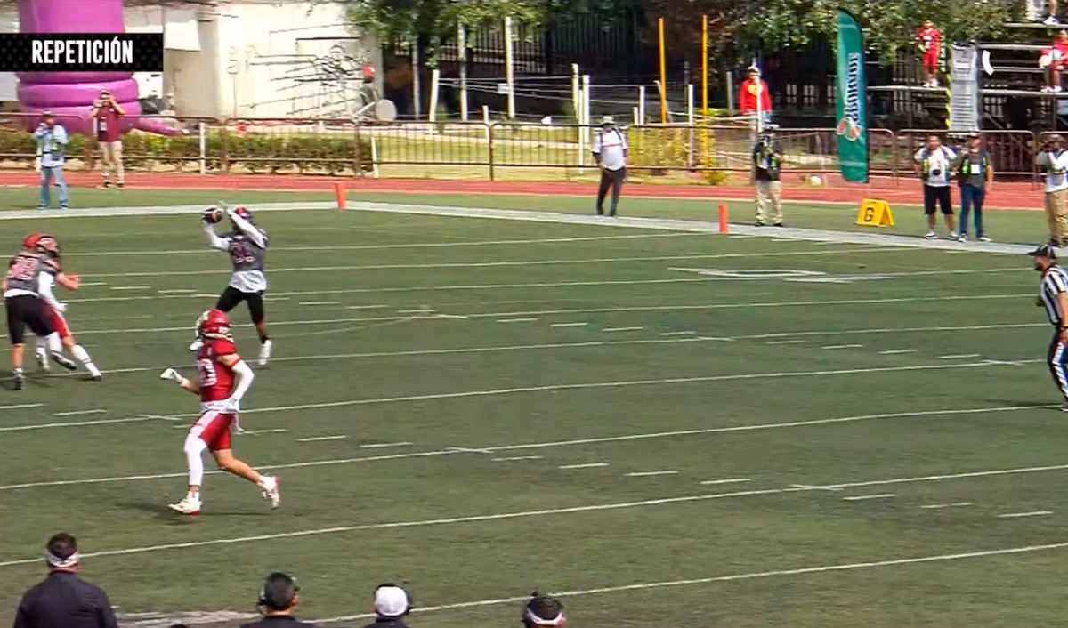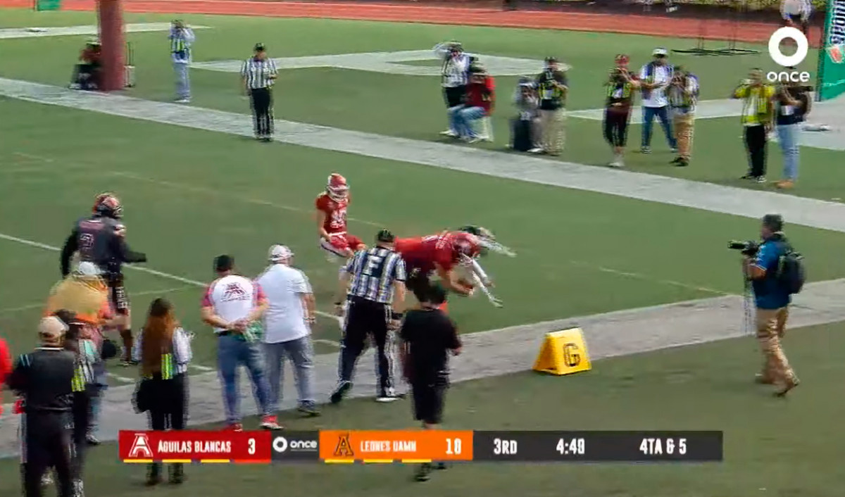 Con un pase corto en 3ra y gol, Patiño encuentra a Harold Garibay en la endzone para anotar el touchdown. No obstante, falla la conversión de dos puntos subsiguiente. 4to cuarto 08:52 | ABL 16-18 LEO. Foto: Canal Once