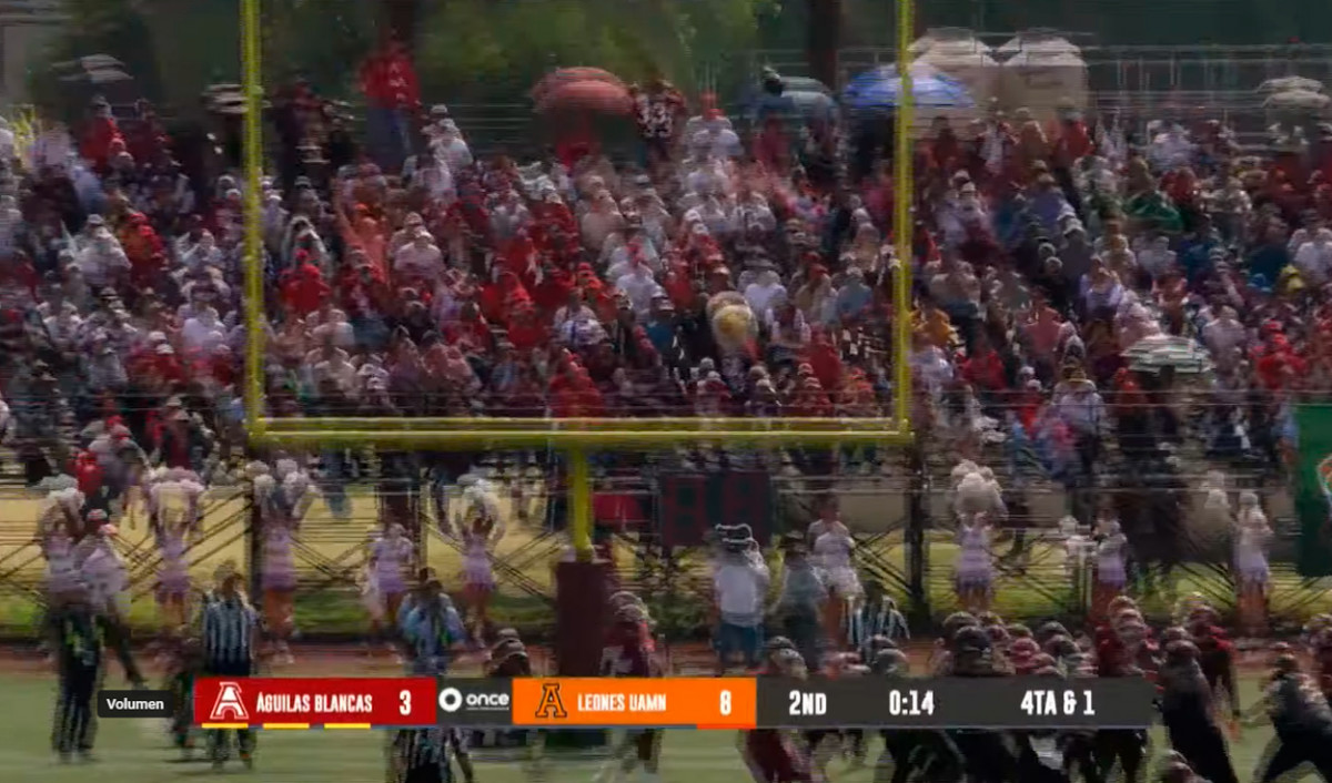 En 4ta y 2 desde la yarda 41 rival, las Águilas Blancas despejaron el balón, pero este fue bloqueado y recuperado por el equipo rival, que se coloca en una situación de ventaja. 2do cuarto 07:52 | LEO 8-3 ABL. Foto: Canal Once