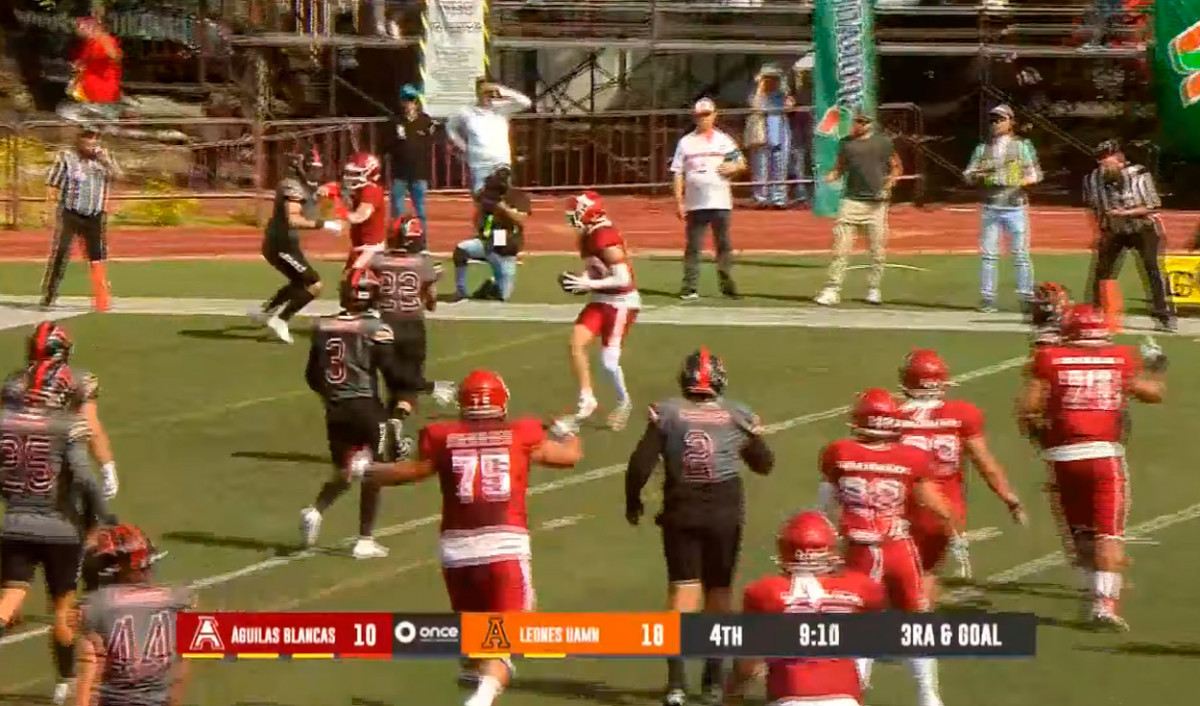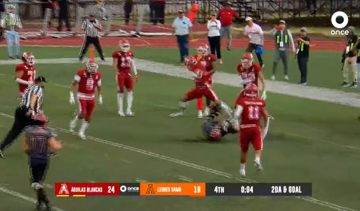 Con una serie de pases aéreos, las Águilas Blancas llegaron a la zona roja sin mayores inconvenientes. En 1ra y 10 desde la yarda 13, Ángel Gutiérrez corre con el balón hasta la zona de anotación. La conversión de dos puntos es buena. 4to cuarto 01:14 | ABL 24-18 LEO. Foto: Canal Once