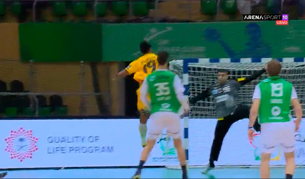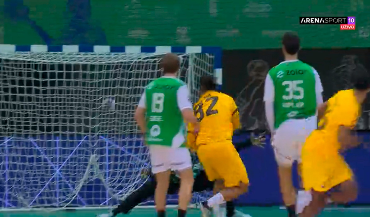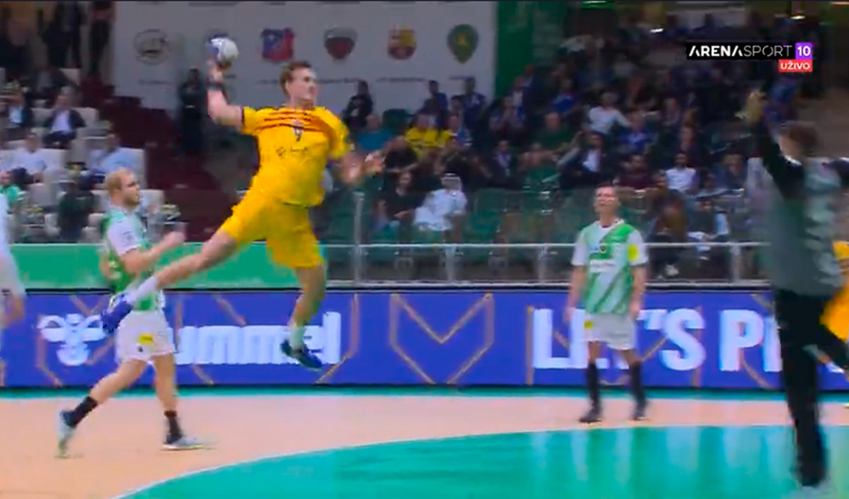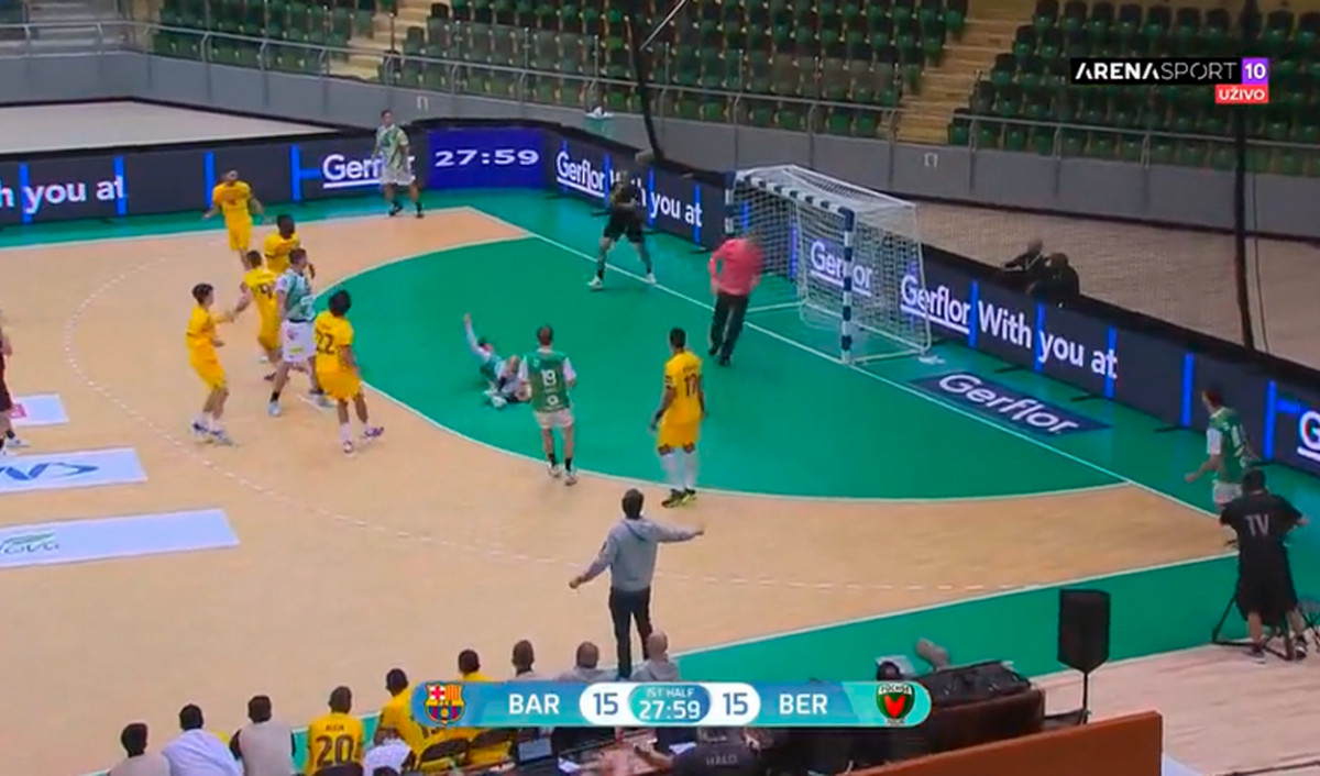 Minuto 47. Pese a la desventaja numérica de 2 minutos por la suspensión de Andersson, el Berlin se las ingenió para anotar 2 goles. Poco después, Frade apareció con su tercer tanto para mantener la ventaja. BAR 24-23 BER. Foto: Arena Sport