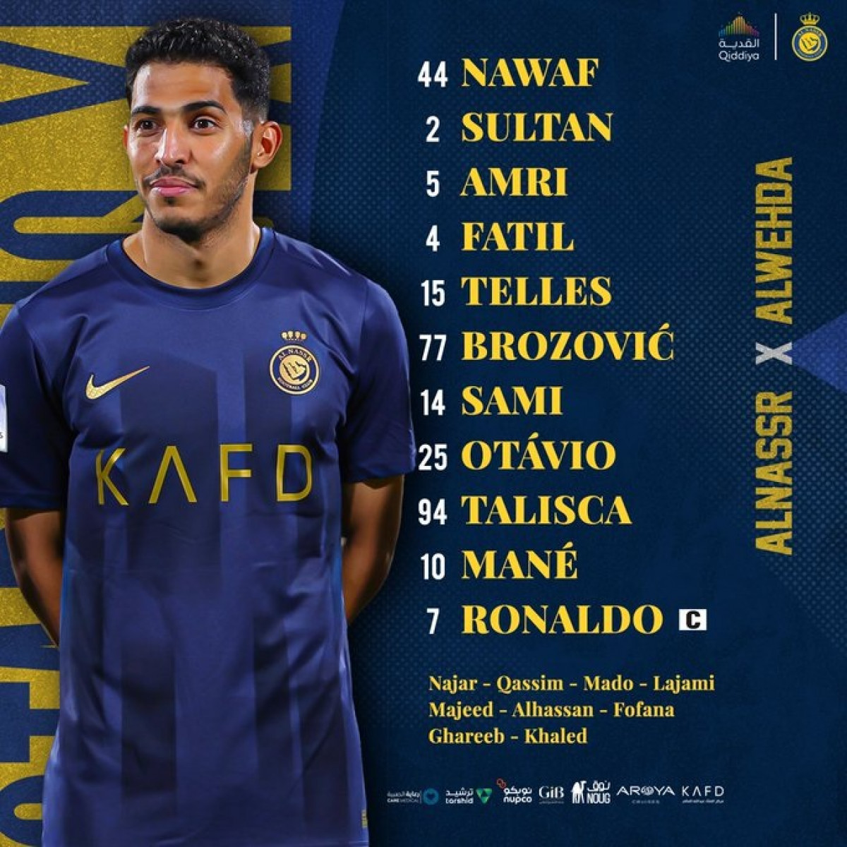 Así formará Al Nassr: Al Aqidi, Al Ghannam, Al Fatil, Al Amri, Telles, Al Naji, Brozovic, Talisca, Otavio, Mané, Cristiano Ronaldo. Foto: X/Al Nassr.