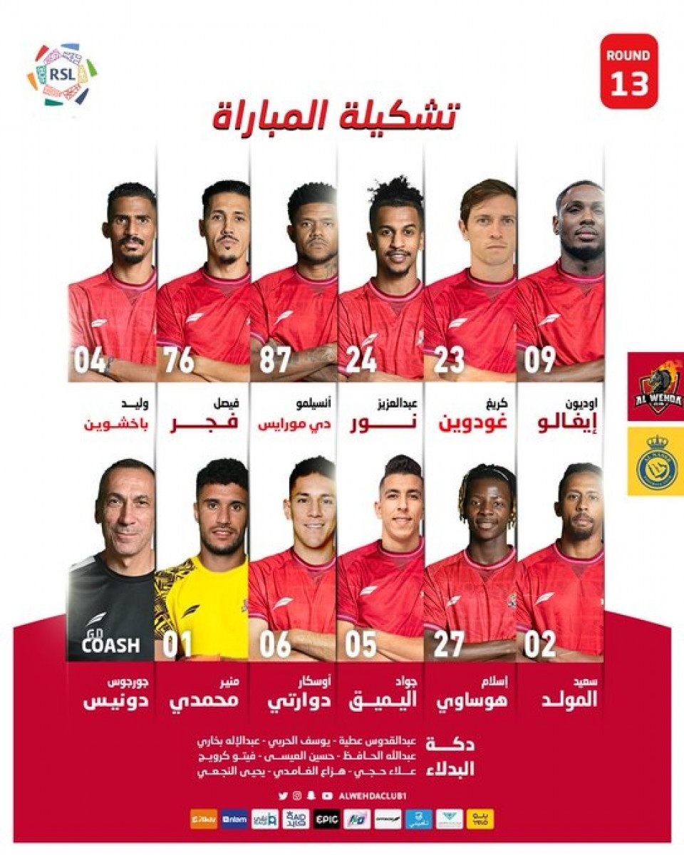 Así formará Al Wehda: Munir, Bakshween, El Yamiq, Duarte, Hawsawi, Fajr, Anselmo, Al Muwallad, Noor, Ighalo, Goodwin. Foto: X/Al Wehda.