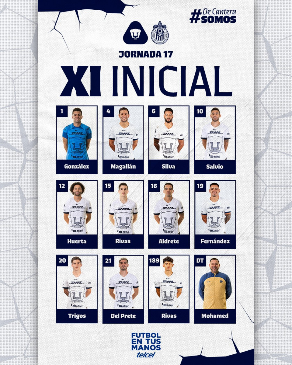 - Pumas: J. González; P. Bennevendo, Nathan, L. Magallán, A. Aldrete; J. Molina, C. Huerta; Salvio, U. Rivas, C. Tabó; G. Fernández.