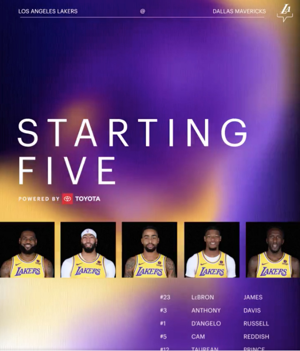 Estos son los jugadores que iniciarán en Los Angeles Lakers: LeBron James, Anthony Davies, D'Angelo Russell, Cam Redidsh y Taurean Prince.