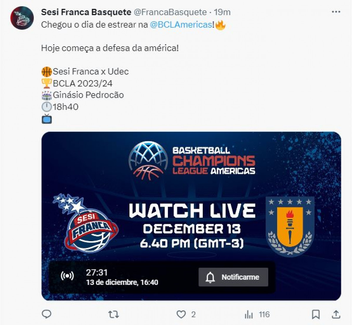 A través de las redes sociales, Franca brindó el canal por donde se podrá seguir el juego ante Universidad de Concepción por la Basketball Champions League Américas 2023-24: