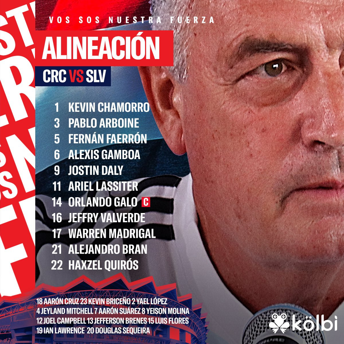 La lista de convocados incluye a los guardametas Kevin Chamorro, Aarón Cruz y Kevin Briceño; defensores como Fernán Faerrón, Yeison Molina, Pablo Arboine, Jeyland Mitchell, Alexis Gamboa, Haxzel Quirós, Douglas Sequeira, Yael López, Ian Lawrence y Jefrey Valverde; volantes como Jefferson Brenes, Orlando Galo, Alejandro Bran, Luis Flores, Joel Campbell, Aarón Suárez, Ariel Lassister y Rándall Leal; y delanteros como Jostin Daly y Warren Madrigal.