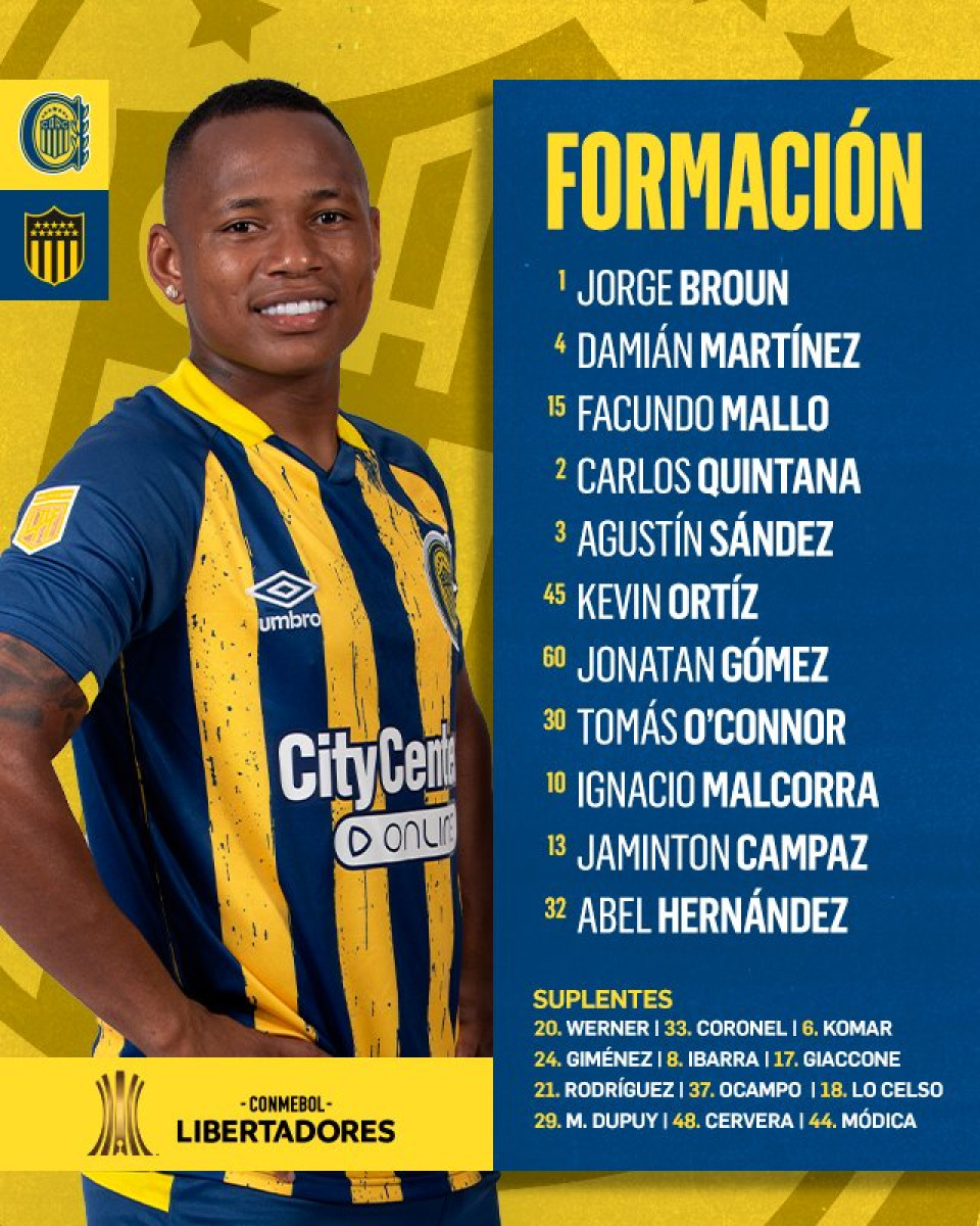 - Rosario Central: Jorge Broun; Damián Martínez, Facundo Mallo, Carlos Quintana, Agustín Sández; Kevin Ortíz, Jonatan Gómez, Tomás O'Connor, Ignacio Malcorra; Jaminton Campaz y Abel Hernández.