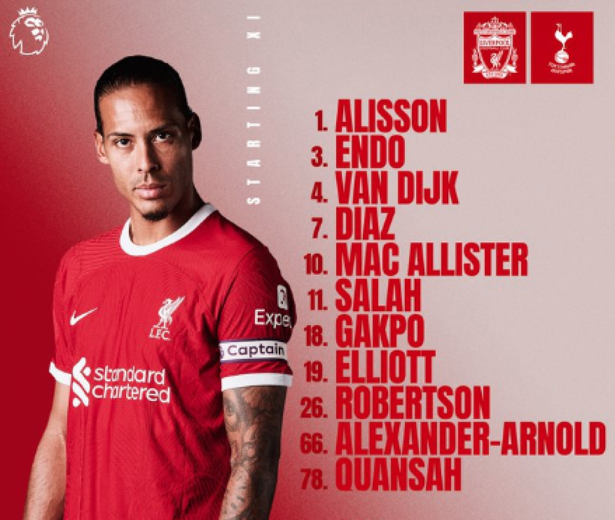 - Alisson Becker; Alexander Trent-Arnold, Jarell Quansah, Ibrahima Konaté; Alexis Mac Allister, Wataru Endo, Ryan Gravenberch; Mohamed Salah, Luis Díaz y Darwin Núñez.